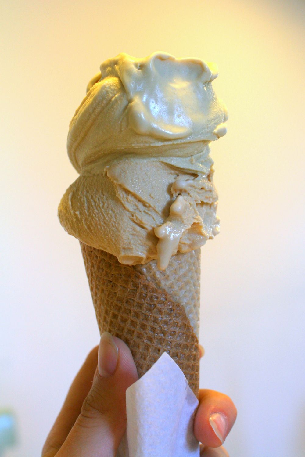 In the case of Mú, you can’t see the colour of the ice cream before but they pride themselves with the claim that they do not use any artificial additions and even use a flat spatula for serving. Looking at the pictures of the four flavours we have tried the last time we have been there – mango and vanilla (Nout) and salted caramel and pistachio (me) – that seems absolutely valid.